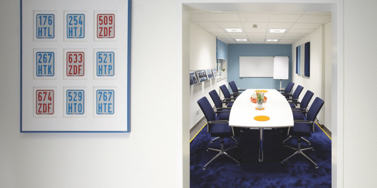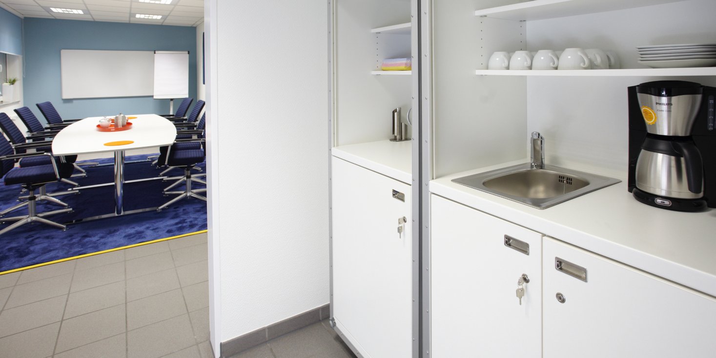 Aus einem ehemaligen Lagerraum wurde mit viel Kreativität ein moderner 25 qm großer Besprechungsraum. Er befindet sich im 1. Obergeschoss der Produktions-halle 1 und bietet durch zwei große Fenster einen spannenden Ausblick. Die Farbgestaltung ist nicht nur hell und freundlich, sondern auch passend zu unseren Hausfarben in weiß, blau und grau gehalten. Der Raum verfügt über einen großen weißen Konferenztisch, an dem bis zu 10 Personen Platz haben. Auch eine kleine Kaffeeküche inklusive Kühlschrank, Kaffeemaschine und Teekocher ist vorhanden.